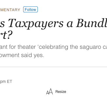 A series of critiques by anti-public funding for the arts writers: On July 11, 2017, Roger Kimball, writing in the Wall Street Journal, disses Standing with Saguaros for its public funding. And on Aug. 2, 2017, Kimi Eisele offers her rebuttal: